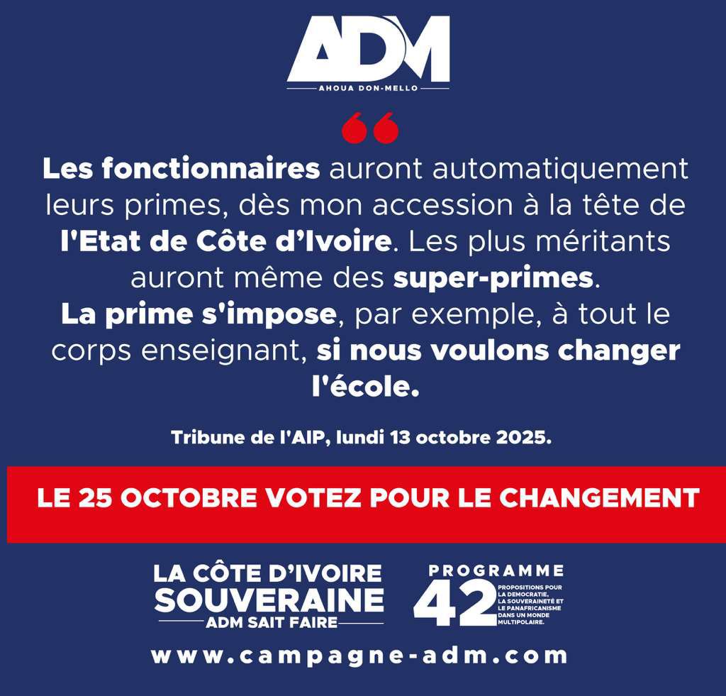 Parmi les cinq candidats déclarés recevables par le Conseil constitutionnel, Don Mello fait donc figure de candidat de la rupture, résolument tourné vers une lecture souverainiste des défis ivoiriens. Les primes aux fonctionnaires s'inscrivent dans cette stratégie : elles symbolisent une volonté de redonner du pouvoir d'achat aux agents de l'État, pilier invisible de tout système administratif.