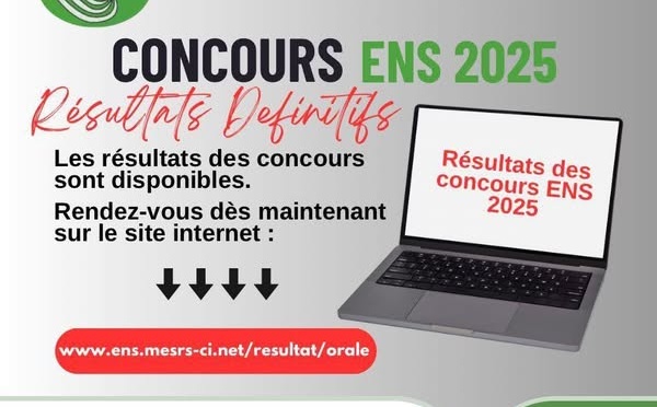 Les résultats définitifs du concours d'entrée à l'ENS 2025 sont publiés en ligne. Les candidats peuvent consulter leurs résultats sur le site officiel.