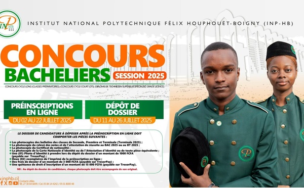 Concours INPHB 2025 Côte d'Ivoire : inscriptions du 2 au 22 juillet, dépôt dossiers jusqu'au 26 juillet, compositions le 11 août, résultats le 19 août.
